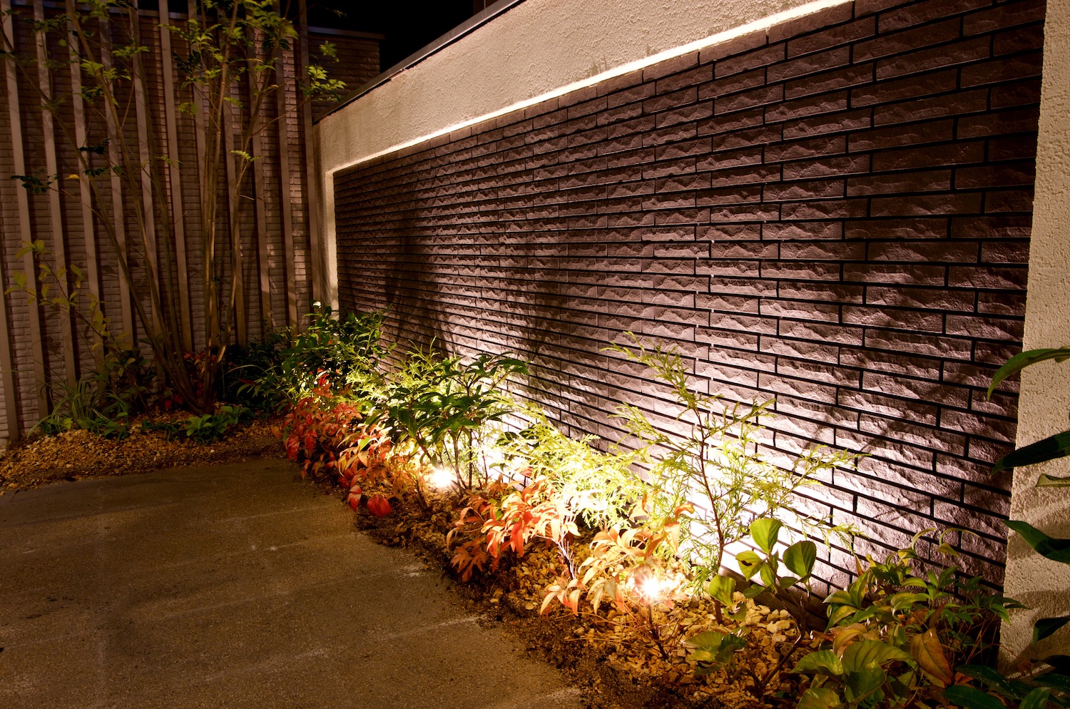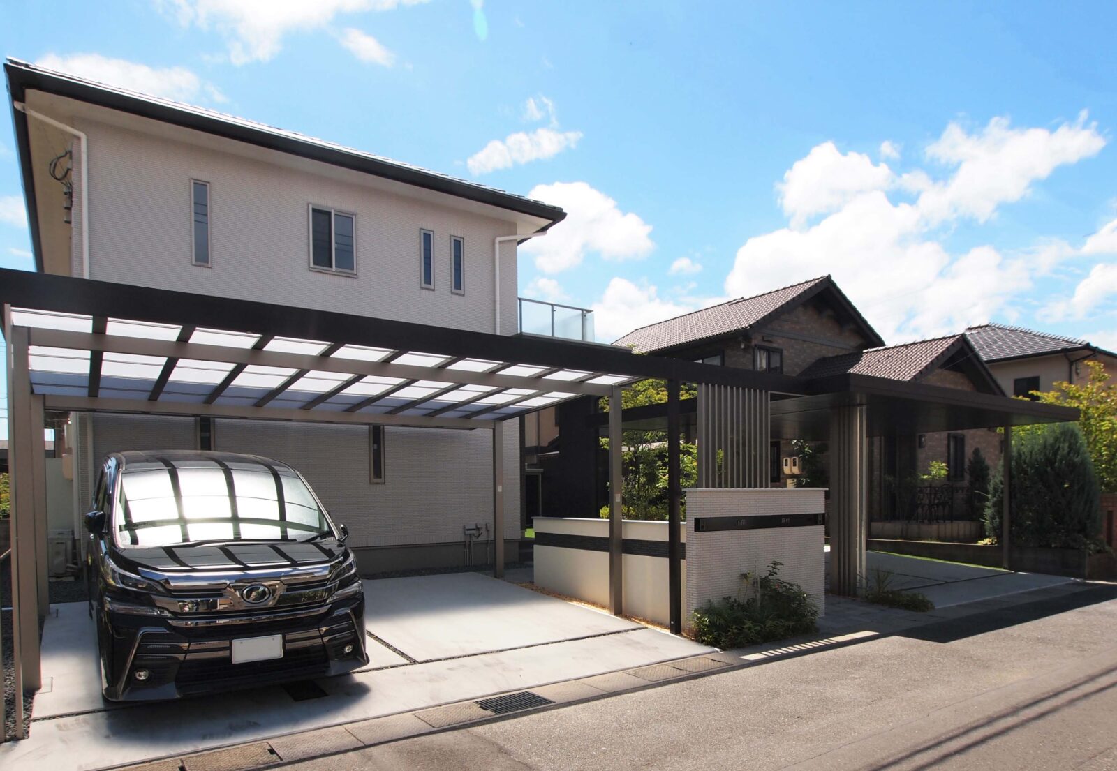 LIXILのGカールーフが重厚感を高める外構・エクステリアです。天井材のダウンライトや袖壁前のグランドライト、EXALIVEのインゴットを照らす照明で昼と夜の表情が変わります。建物と同じタイルを貼った門柱や袖壁が統一感を引き出します。人工芝敷きの中庭はご家族の憩いのスペースとしてご活用いただいています。