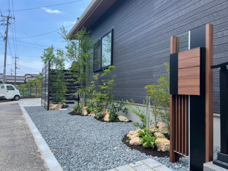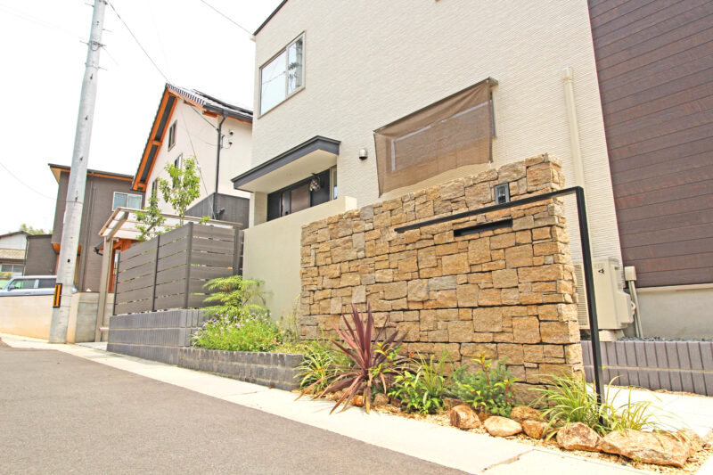 温かみのある石の風合いと、植栽のやわらかなグリーンが美しく調和🌱