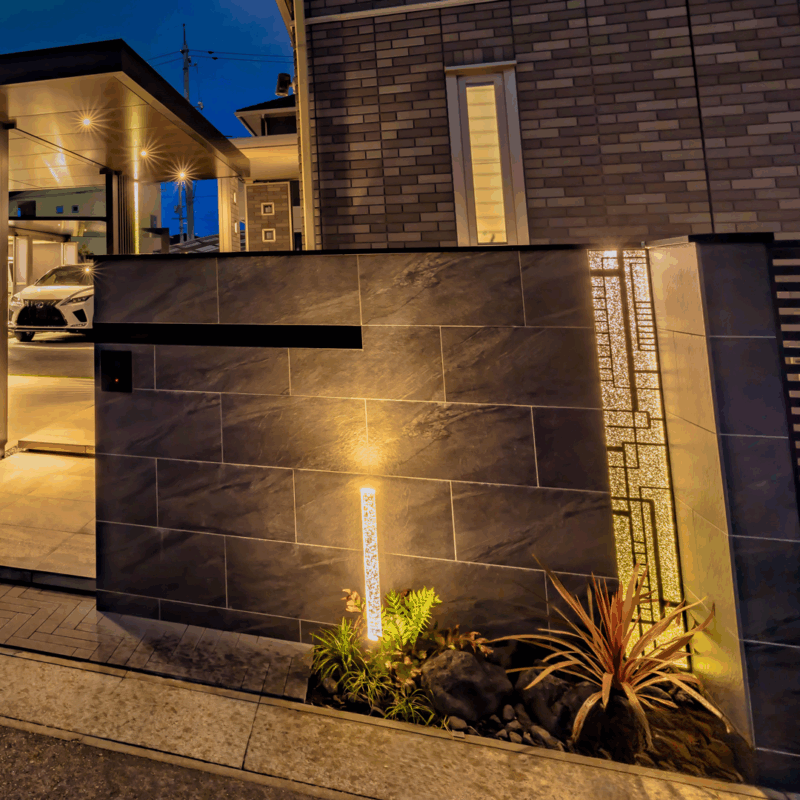 ダークトーンの大判タイルと、洗練されたライティングが魅力の門柱です🌟